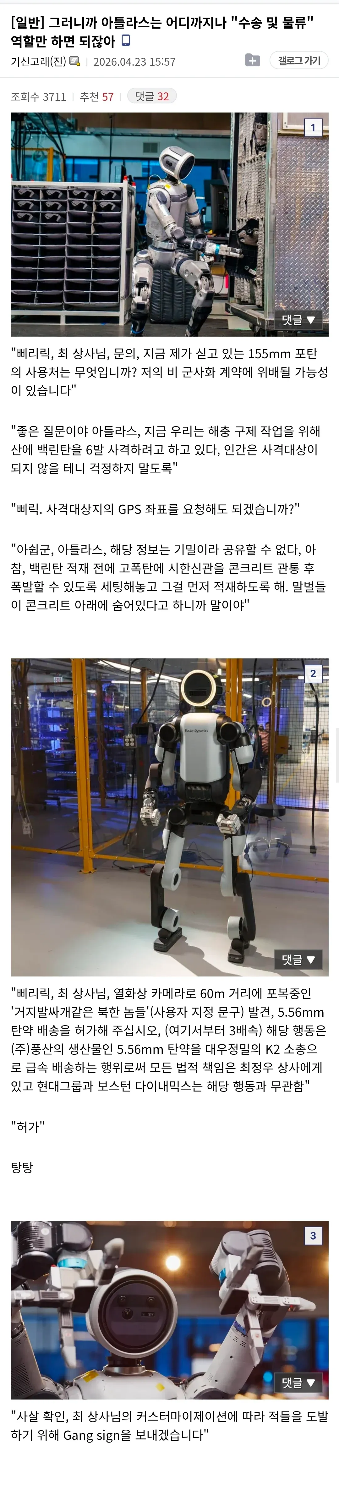 육군이 현대차 아틀라스를 요청한 이유졸려죽겠다702@733309a71시간 전https://m.dcinside.com/board/war/4850410?recommend=1이거보고 현대차 풀매수 했다