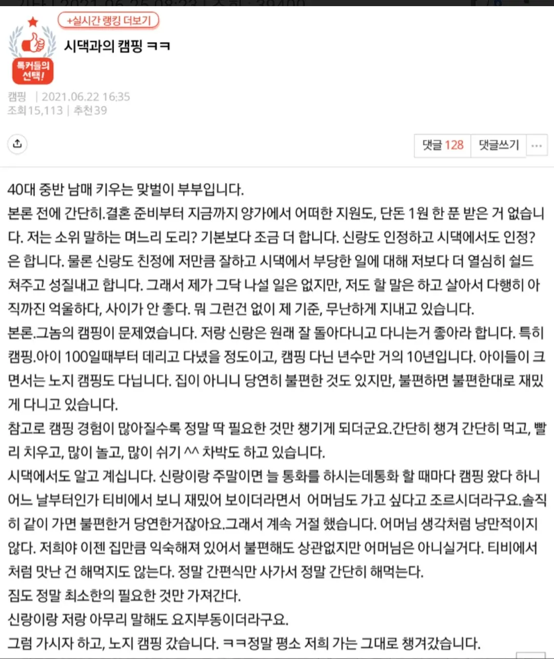 시댁과의 캠핑 여행 관련 온라인 커뮤니티 댓글