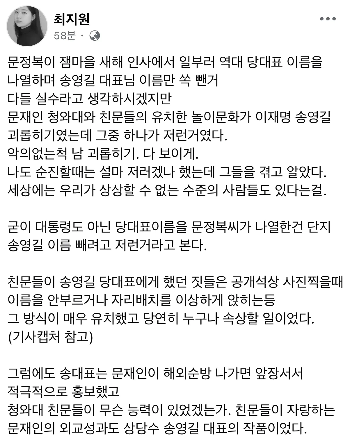 청와대 시절 이재명한테 했던 유치한 일진놀이 아직도 하고 있는 친문 패거리들치킨은살안쪄@c039939c2일 전 이랬던 친문 패거리들이 송영길 민주당 전 당대표한테 이러고 있음 문정복은 이번에 최고위원 후보 출마한 사람인데저런 유치한 짓을 이재명 팬카페 와서 함