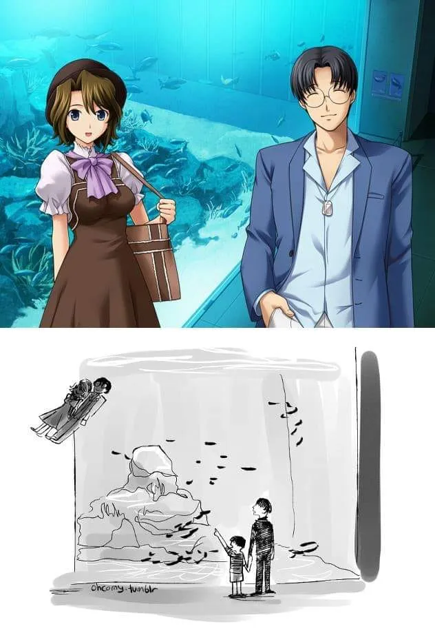 아이가 이상한 사람들을 가리키며 아빠에게 말하는 장면