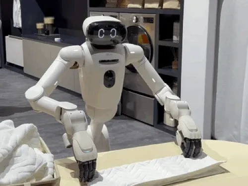 전시관 내 'AI 홈 존'에서는 클로이드의 실제 집안일 시연이 이어졌다. 클로이드는 냉장고 문 앞에 멈춰 서서 우유를 꺼내 식탁 위에 올려놓았다. 이어 크루아상이 담긴 그릇을 오븐 안으로 조심스럽게 옮겼다. 빨래 시연에서는 빨래통에서 옷과 수건을 하나씩 집어 세탁기에 넣고, 세탁이 끝난 수건을 개는 동작까지 이어졌다. 비록 서툴렀지만 손가락으로 빨래를 짚어 개는 모습에 시선이 쏠렸다.