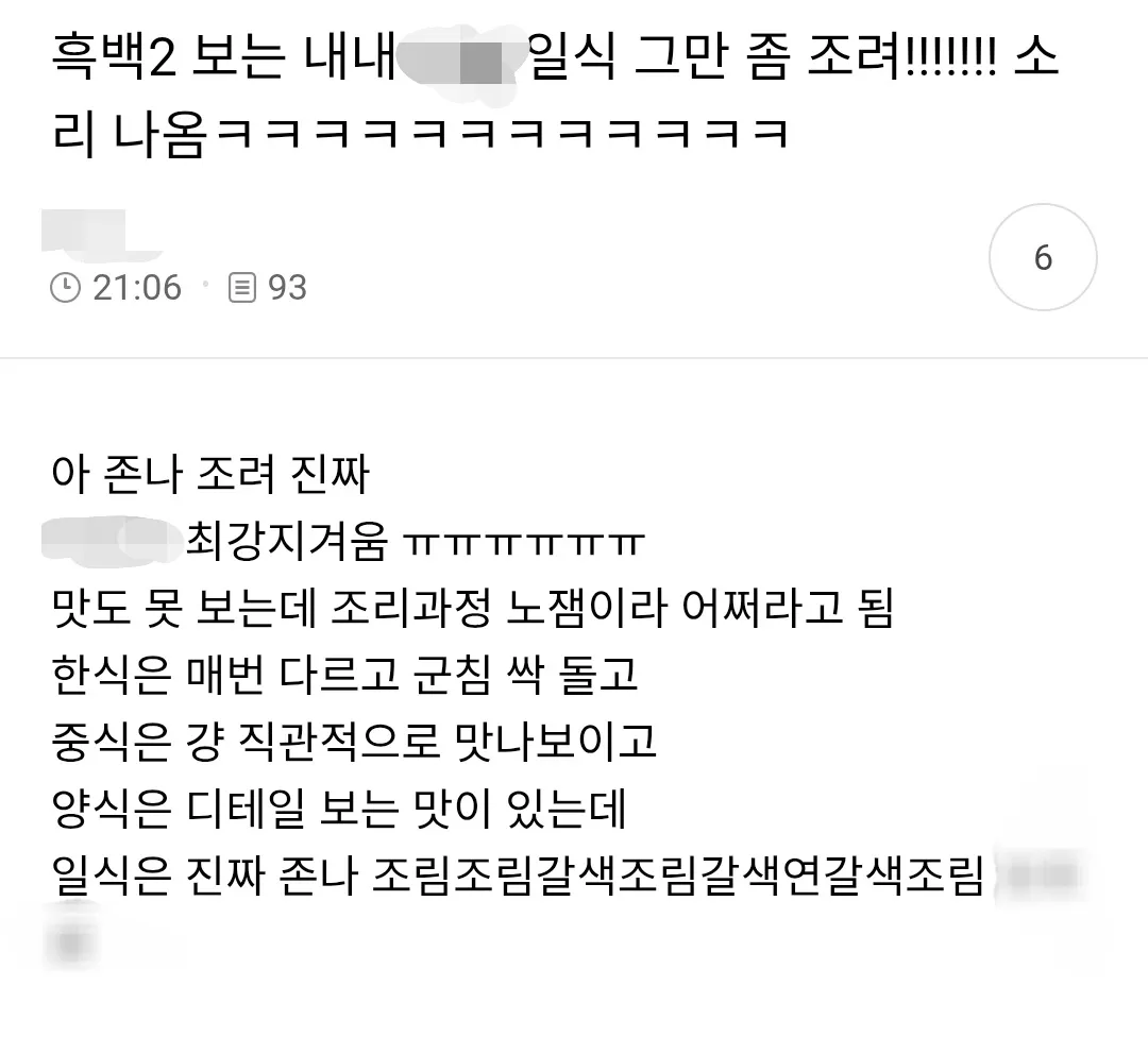 출처 ㅇㅅㅅㄷ 바로 일식 정호영 개인에 대한 감정은 없지만 일식 자체가 비슷비슷한 베이스를 사용하기 때문에 안 봐도 맛을 알 것 같다는 평이 다수.. + 그 외에도 비슷한 반응들 꽤 보임 케톡에서도 주기적으로 일식은 요리경연에선 좀 노잼이라는 의견 나옴일식 하지마라 ㄴㄴ 보기 싫다 ㄴㄴ당연히 요리사 개개인은 잘해서 올라간거ㅇㅇ걍 보기에 소스가 다양하거나 조리법이 많은 장르는 아니구나 ㅇㅇ