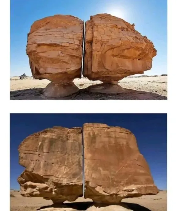 사우디아라비아 사막의 알 나스라 암석, 깔끔하게 두 쪽으로 갈라진 거대한 바위