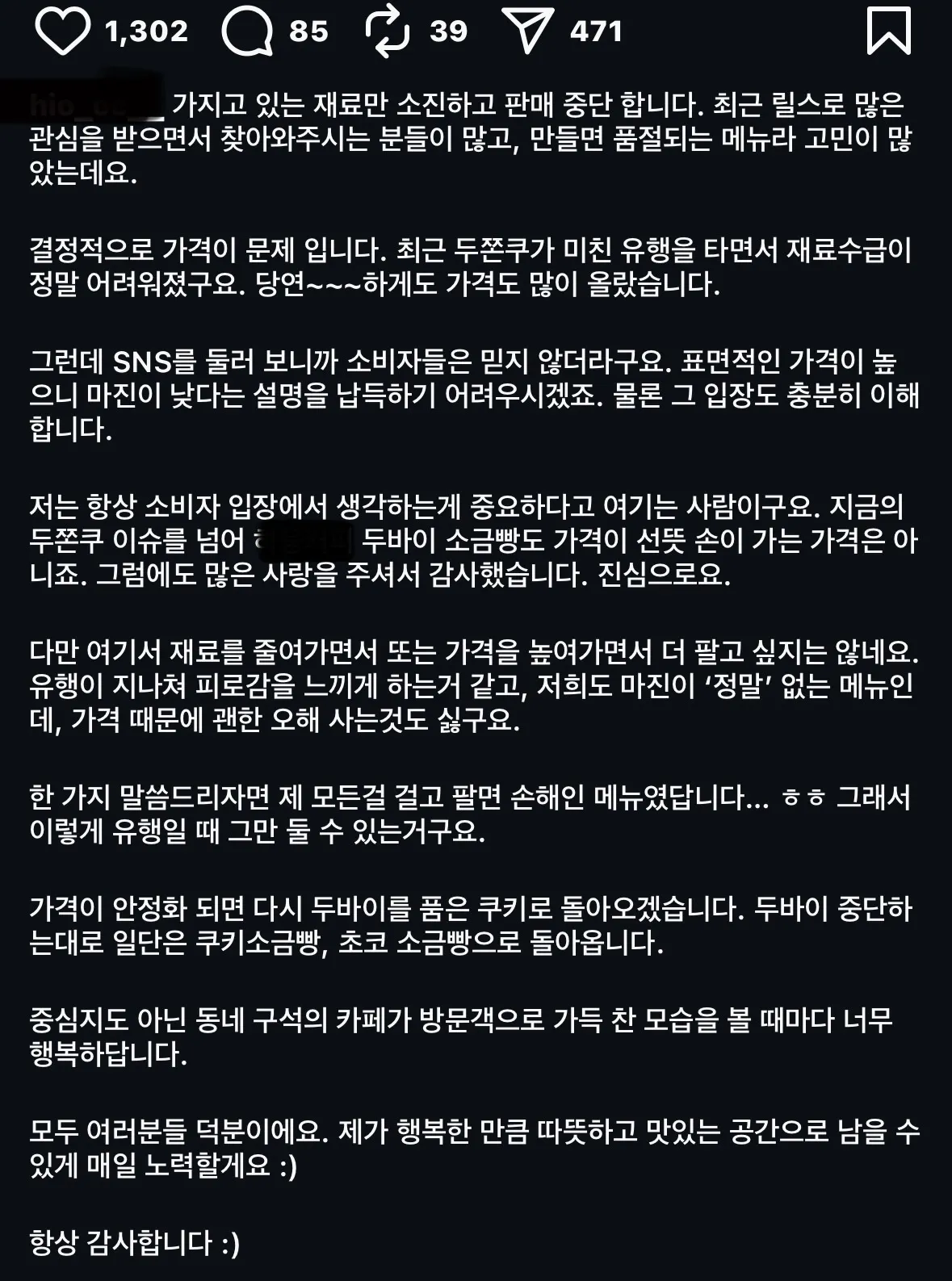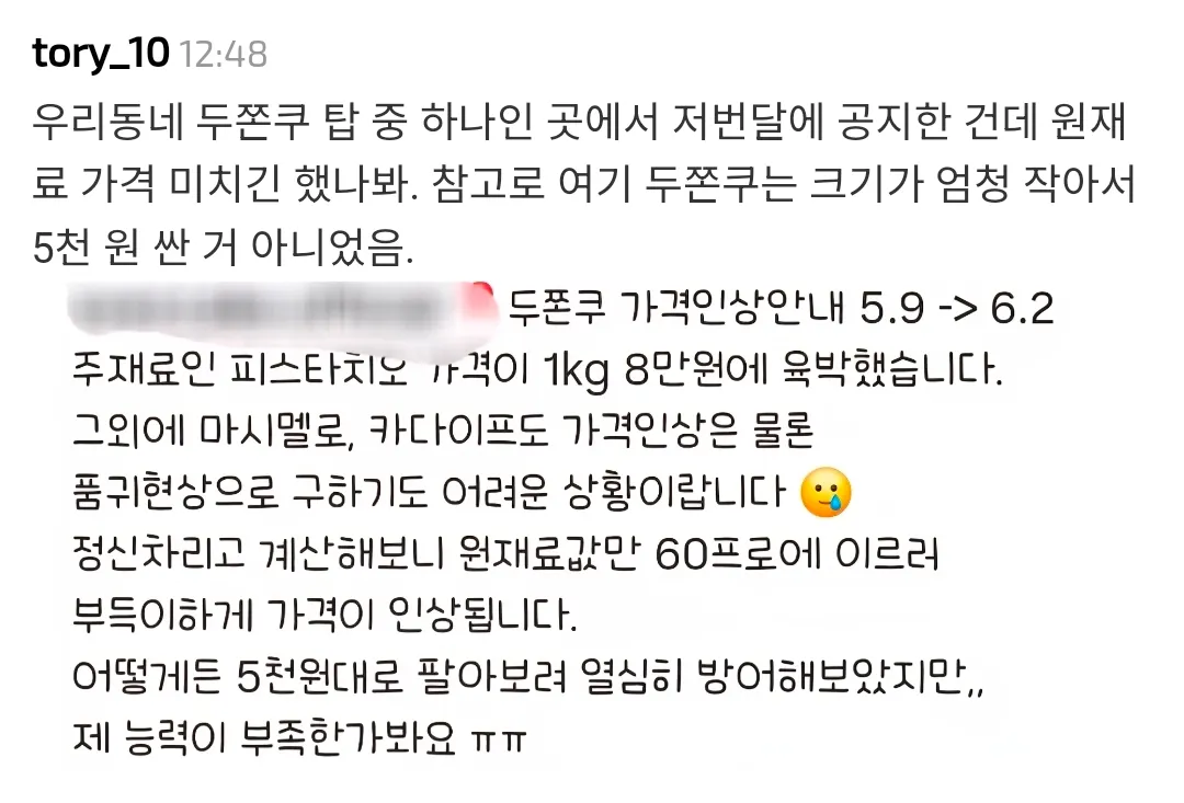 기본 소금빵 3천원, 두바이 소금빵 7천원이었다고 함 그런데도 원재료 가격 너무 올라서 두바이 소금빵은 마진 안남는다는 거.. ㅊㅊ ㄷㅁㅌㄹ 아니 글 좀 읽어봐 재료 가격 안정화 되면 다시 판다잖아!!!!!!! 이게 단순히 팔기 싫어서 접는거냐고!!!!!! (댓글 몇몇개 답답 터져서 사족씀)
