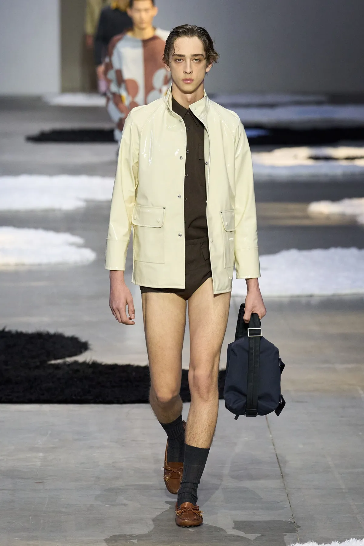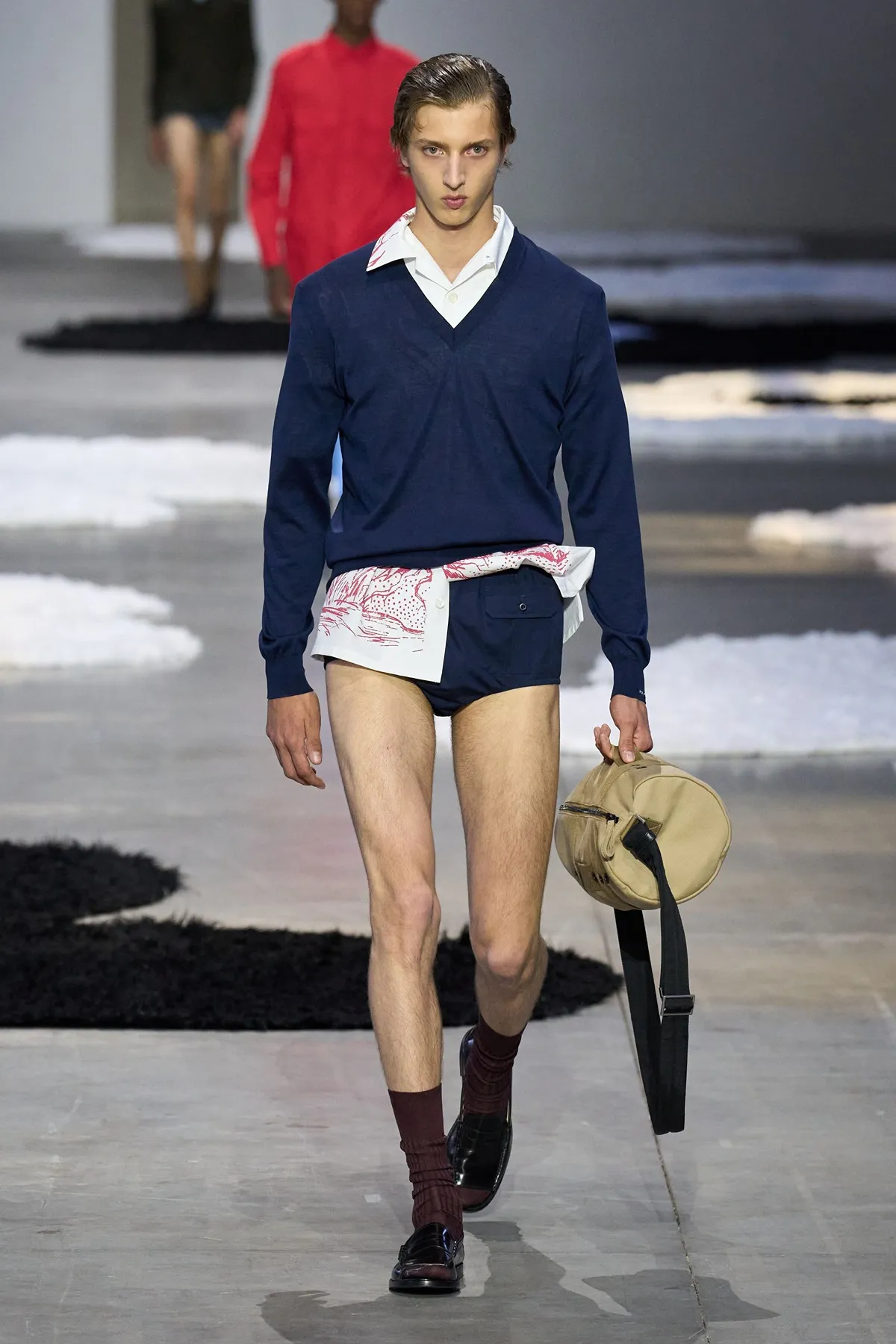프라다 S/S 2026 남성 컬렉션의 하이컷 쇼츠 런웨이 룩