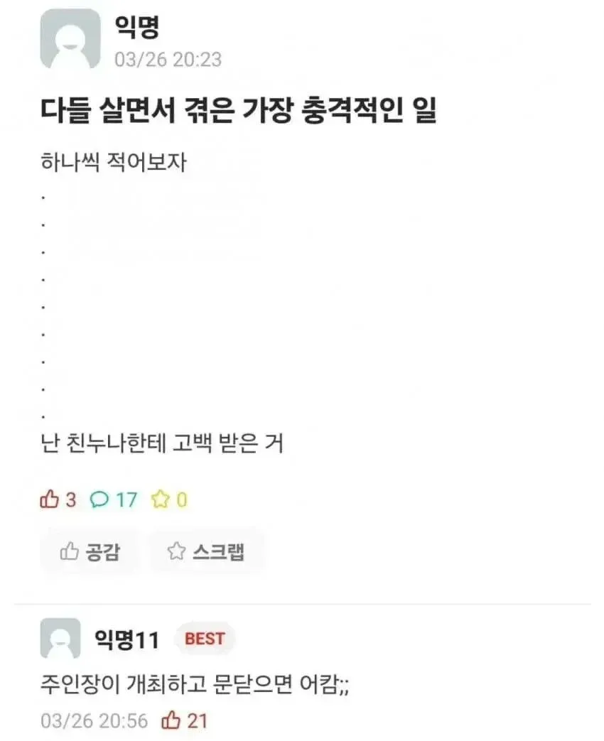 다들 살면서 겪은 가장 충격적인 일 말해보자